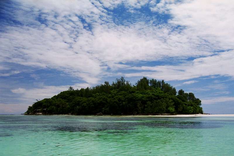 Boats shuttle tourists between beach and yachts on Cousin Island